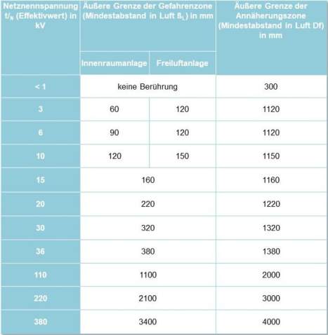 Gemäß Anhang A der DIN VDE 0105-100 wird Arbeit, bei der ein Mitarbeiter den Annäherungsbereich mit Körperteilen, Werkzeugen, Geräten oder Ausrüstung betritt, jedoch nicht die Gefahrenzone erreicht, als Arbeit in der Nähe von lebendigen Teilen definiert. Die Gefahrenzone ist als der 'Bereich um lebendige Teile' definiert, in dem das erforderliche Schutzniveau zur Vermeidung einer elektrischen Gefährdung im Falle des Eintritts ohne Schutzmaßnahmen nicht gewährleistet ist." Die Nähezone ist ein Sicherheitsbereich um die Gefahrenzone herum. Die Tabelle zeigt die Grenzen der Annäherungs- und Gefahrenzonen abhängig von der Spannungsebene auf.