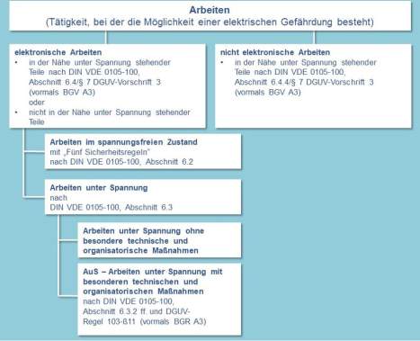 Diese technisch-organisatorischen Maßnahmen zum Arbeiten unter Spannung (AuS) werden in DIN VDE 0105-100 und der DGUV-Regel 103-011 (vormals BGR A3) wie folgt vorgegeben: