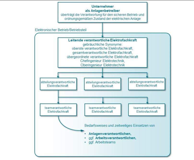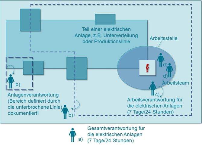 Beim Betrieb von elektrischen Anlagen wird zwischen verschiedenen Verantwortungsebenen unterschieden: Die Gesamtverantwortung liegt beim Anlagenbetreiber, der die unternehmerische Verantwortung trägt. Für den Anlagenbereich, in dem sich ein Arbeitsplatz befindet, muss für die Dauer der Arbeit eine für die Anlage verantwortliche Person bestellt werden. Der Arbeitsleiter ist für die sichere und fachgerechte Arbeit des Arbeitsteams am Arbeitsort verantwortlich. Anlagen- und Arbeitsleiter müssen nicht zwangsläufig verschiedene Personen sein. Es besteht grundsätzlich sogar die Möglichkeit, dass der Elektriker, der die Arbeit ausführt, gleichzeitig die Rolle des für die Anlage verantwortlichen und des für die Arbeit verantwortlichen erfüllt. Die Rolle a) "Anlagenbetreiber" wird in kleineren Unternehmen und Privathaushalten vom Eigentümer gespielt und in größeren Unternehmen vom Unternehmer übernommen, der von der Geschäftsführung oder einem beauftragten Anlagenbetreiber eingesetzt wird. Die Rollen b) "für die Anlage verantwortliche Person", c) "für die Arbeit verantwortliche Person" und d) "Mitarbeiter im Arbeitsteam" werden in kleineren Unternehmen und Privathaushalten vom (beauftragten) Elektriker besetzt. In größeren Unternehmen muss die Rolle b) "Anlagenleiter" schriftlich benannt werden. Die Rolle c) "Arbeitsleiter" wird vom Leiter des Arbeitsteams vor Ort (z. B. Gruppenleiter) ausgefüllt.